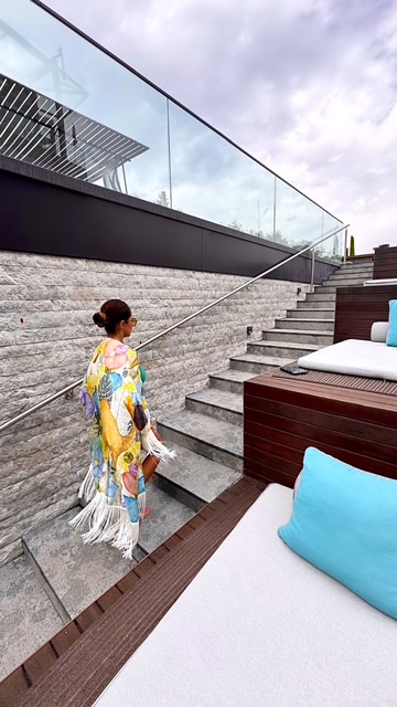 Was ich besonders mag: Wie sich die Farben des Kimonos mit meiner Umgebung verbinden – das Glitzern des Wassers, die Wärme der Sonne, ein paar Blumen auf der Terrasse. Es sind diese kleinen Details, die das Outfit lebendig machen.